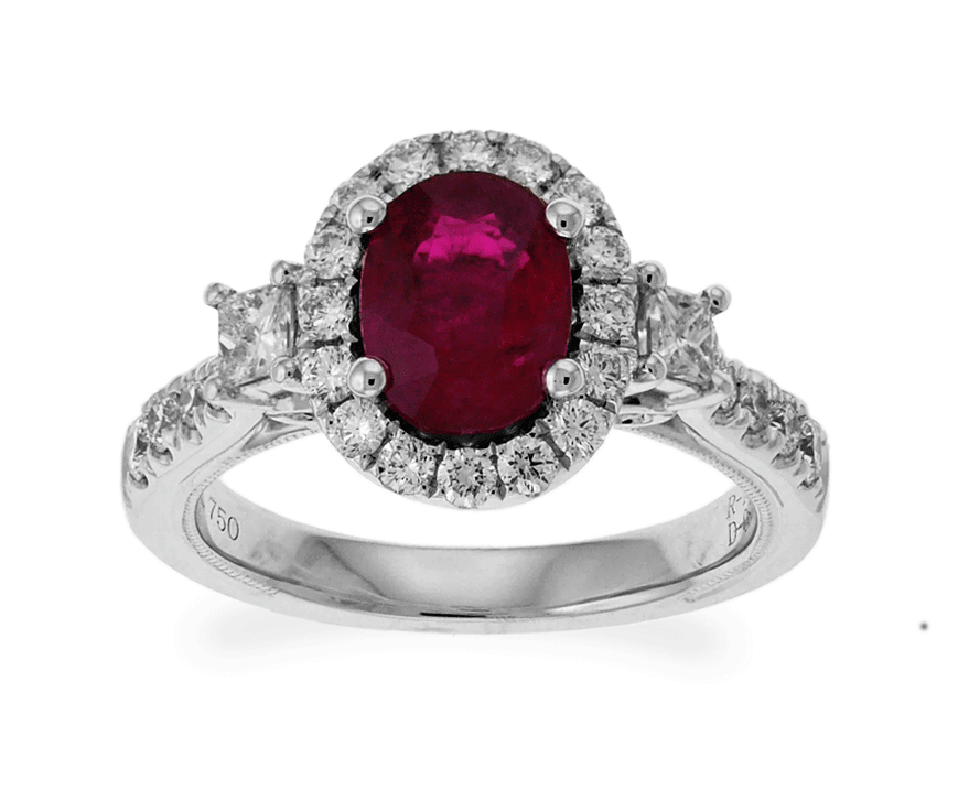 This gorgeous solitaire ring features oval shaped cut the most radiant purplish red ruby at center and square shaped cut brilliant diamonds enclosed with small brilliant round shaped cut diamonds pave-set in 18k white gold. This ring is proficiently created by Carnation Designs and its Signature is on its shank. It will bring you to wear perfectly at any time with any wardrobe and your treasure forever!!!