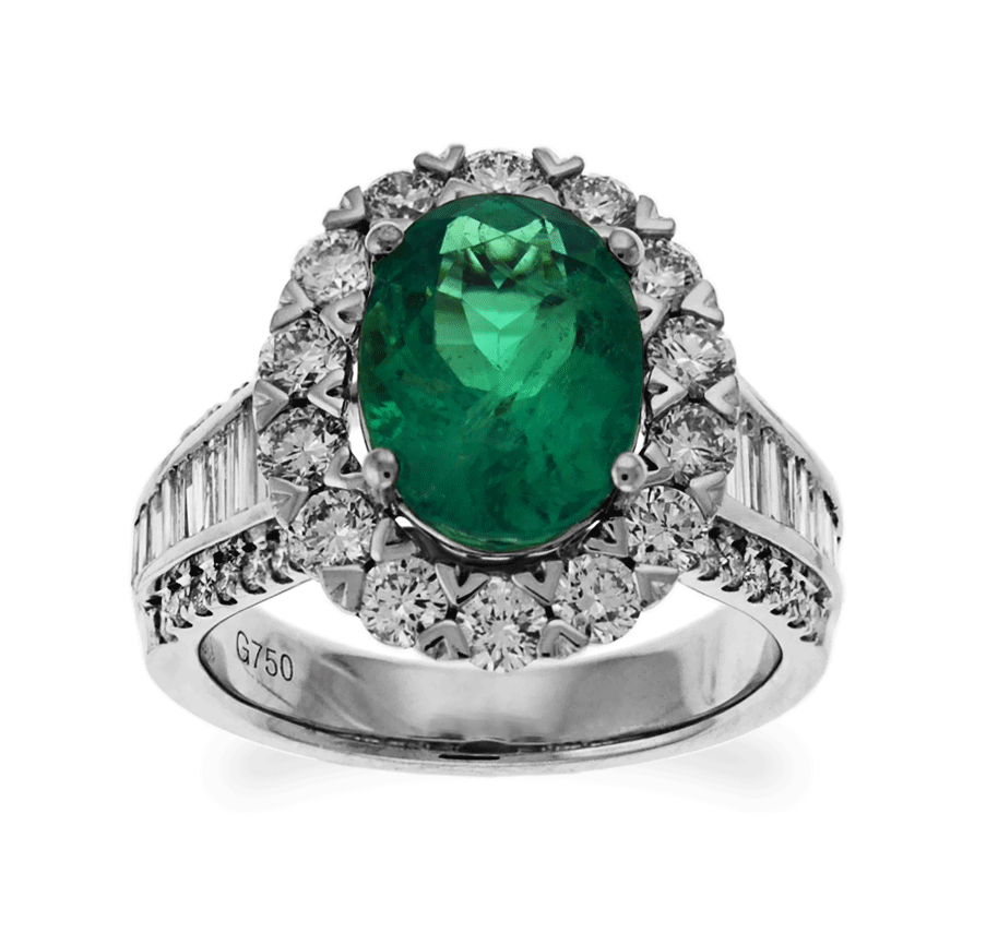 This stunning ring features a frame of pave set; oval shaped cut deep green emerald surrounded by small round-cut brilliant diamonds on top. It is accented by small round cut and baguette cut brilliant diamonds in 18k white gold. Carnation Designs’ Signature ring will bring you to wear with any wardrobe at any time on your finger forever!!!