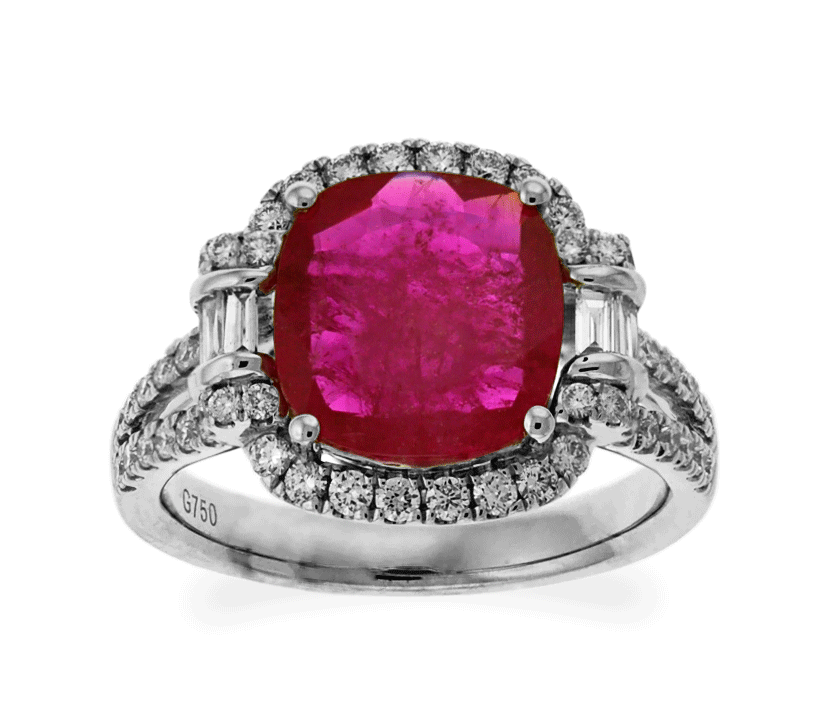 This gorgeous ring is made beautifully from Carnation Designs Signature. It features cushion shaped cut the most radiant purplish red ruby at center and the collection of same quality of small baguette and round shaped cut brilliant diamonds pave set. This 18k white gold fashionable ring will bring you to wear at any time with any wardrobe for your unique style.