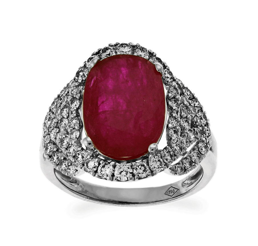 This gorgeous ring is made beautifully from Carnation Designs Signature. It features oval shaped cut the most radiant purplish red ruby at center and the collection of same quality of small round shaped cut brilliant diamonds pave set. This 18k white gold fashionable ring is for any wardrobe to add your loveliness and you will love to wear it forever!!!