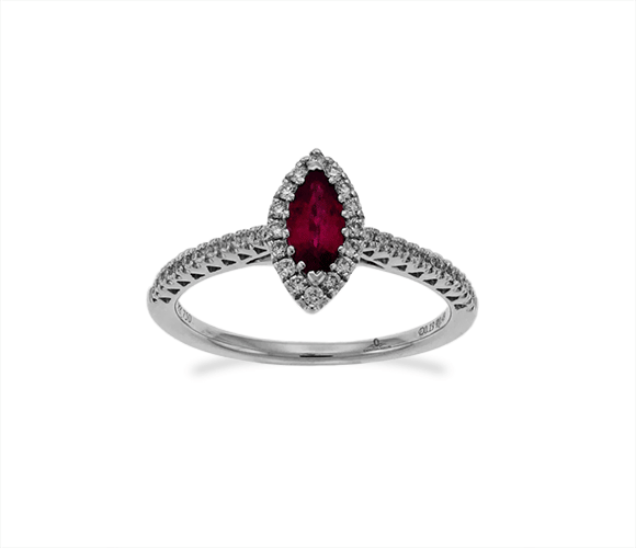This amazing solitaire ring features the most radiant purplish red marquise shaped cut ruby at center enclosed with small round cut brilliant diamonds pave-set in 18k white gold. This ring is proficiently created by Carnation Designs and its Signature is on its shank. It will bring you to wear at any time with any wardrobe for your unique style.