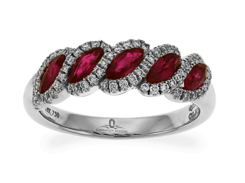 Carnation Designs Signature ring features five marquise shaped cut the most radiant purplish red rubies that are surrounded by small round shaped cut brilliant diamonds pave-setting. This beautiful 18k white gold ring is perfectly matched to wear at any time with any wardrobe. You will love to wear it for a more glorious style.