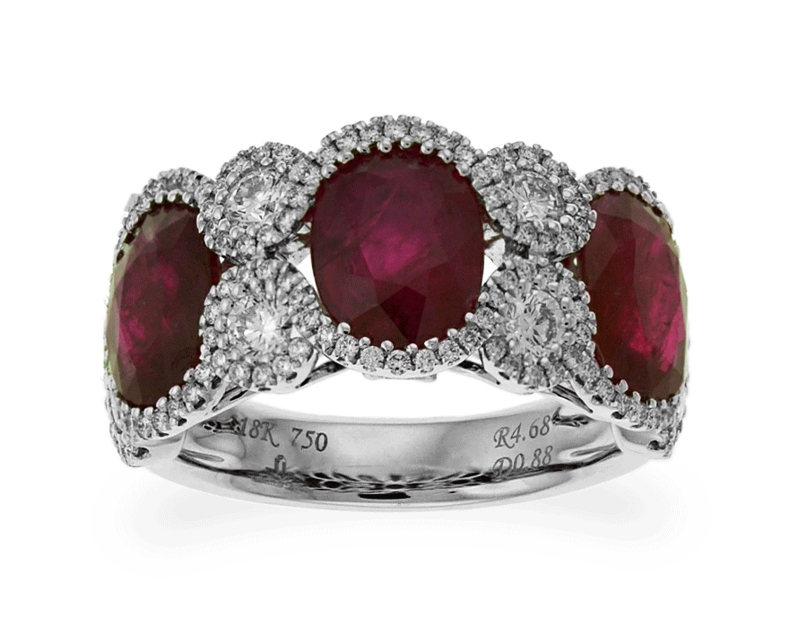 This Carnation Designs Signature ring features a collection of same quality of three oval shaped cut deep purplish red rubies at center and surrounded by a beautiful design of brilliant small round cut diamonds pave set in 18k white gold. You can wear any wardrobe at any time. It will bring your treasure forever!!!
