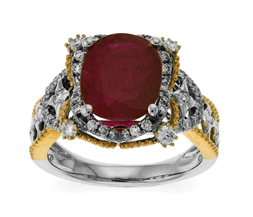 This gorgeous solitaire two tone ring features oval shaped cut the most radiant purplish red ruby at center that is surrounding with small sparkling diamonds pave-set in 18k white gold. This ring is proficiently created by Carnation Designs and its Signature is on its shank. It will bring you to wear any wardrobe at any time.
