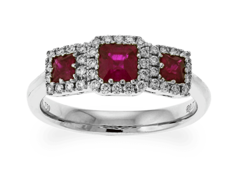 This amazing three stones rubies ring features one emerald shaped cut the most purplish red ruby in center with surrounding round-cut brilliant diamonds and one small deep purplish red color of square shaped cut ruby accented on each side in 18k white gold band. This ring is beautifully created by Carnation Designs and its Signature is on its shank. It will bring you to wear your treasure forever!!!