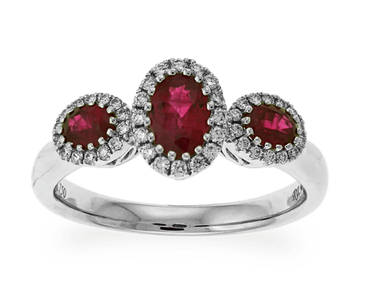 This stunning three stones rubies ring features one oval shaped cut the most purplish red ruby in center with surrounding round-cut brilliant diamonds and one small deep purplish red color of oval shaped cut ruby accented on each side in 18k white gold band. This ring is beautifully created by Carnation Designs and its Signature is on its shank. It will bring you to wear your treasure forever!!!