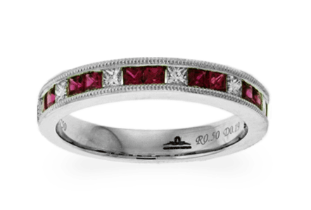 This classical style ring features a single row of two square shaped-cut purplish red rubies and one square cut brilliant diamond by accenting alternately. This ring sets a frame of pave-set precious stones going half-way around in 18k white gold band and Carnation Designs Signature is on its shank. You will love it your treasure forever!!!