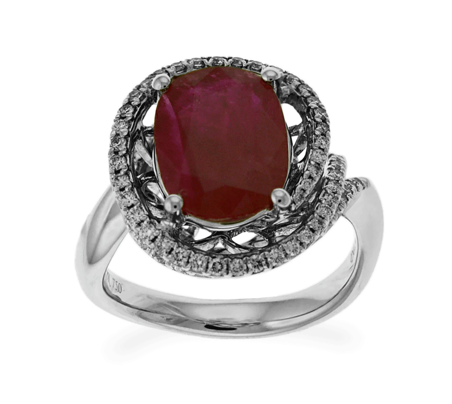 This stunning ring is made beautifully from Carnation Designs Signature. It features an oval shaped cut the most radiant purplish red ruby at center and the collection of same quality of small round cut brilliant diamonds pave set. This 18k white gold fashionable ring is for any wardrobe to add your loveliness and you will love to wear it forever!!!