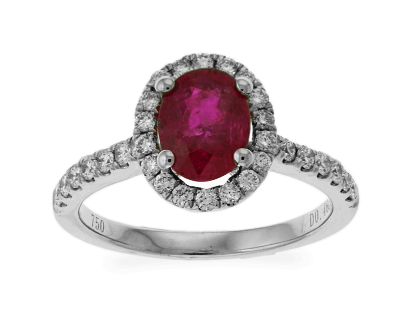 This amazing solitaire ring features an oval shaped cut the most radiant red ruby at center enclosed with small round cut brilliant diamonds pave-set. This ring is proficiently created by Carnation Designs and its Signature is on its 18k white gold shank. It will bring you to wear at any time with any wardrobe for your unique style.