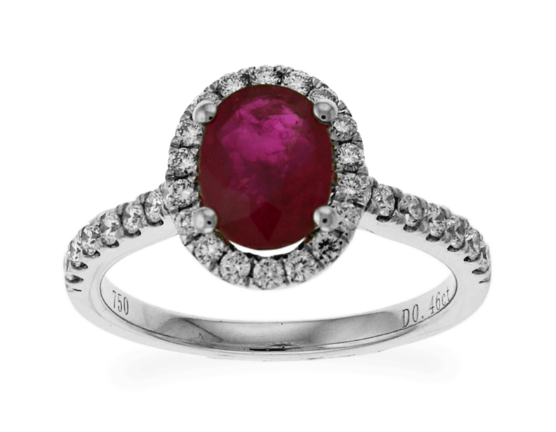 This fabulous solitaire ring features an oval shaped cut the most radiant red ruby at center enclosed with small round cut brilliant diamonds pave-set in 18k white gold. This ring is proficiently created by Carnation Designs and its Signature is on its shank. It will bring you to wear at any time with any wardrobe for your unique style.