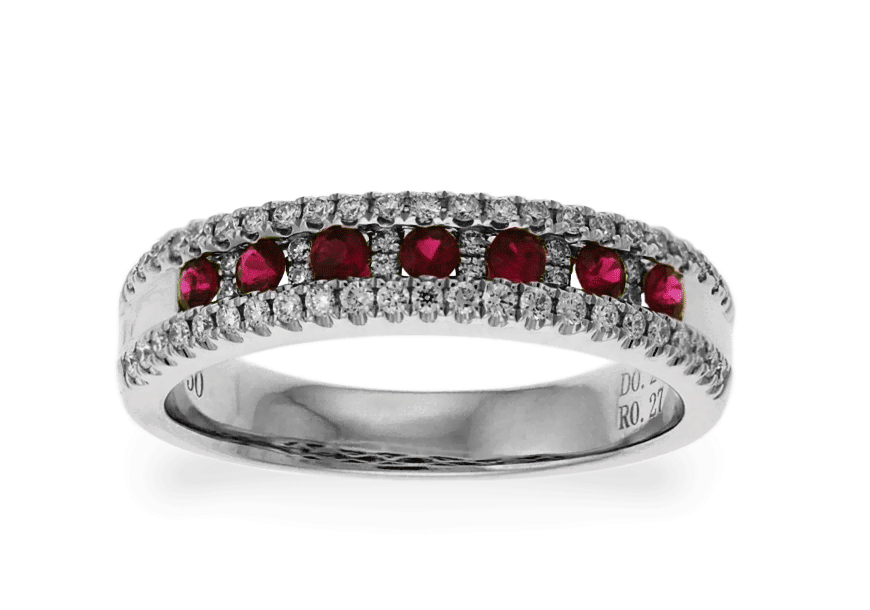 This Carnation Designs Signature ring features a collection of same quality of seven small round shaped cut purplish red rubies row at center and surrounded by same quality of brilliant small round cut diamonds rows pave set in 18k white gold. It can wear for you perfectly at any time with any wardrobe forever!!!