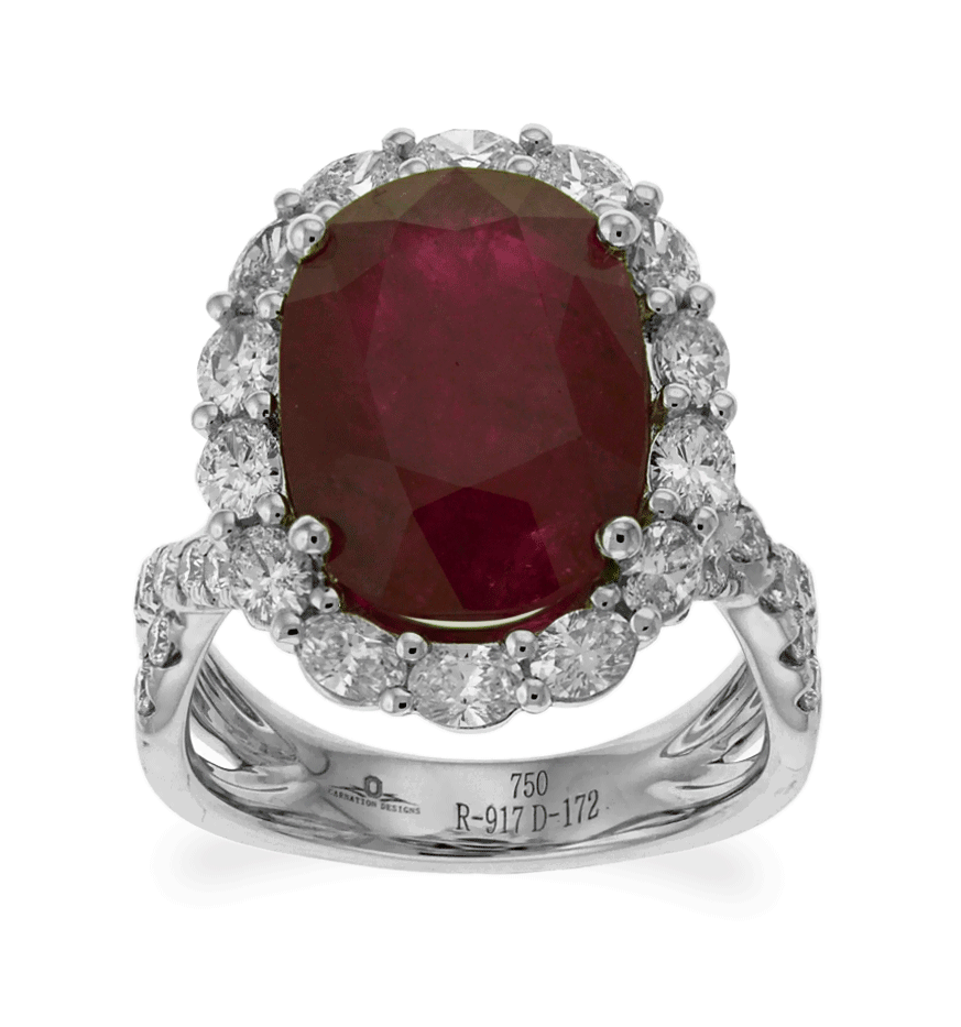 This gorgeous ring is made beautifully from Carnation Designs Signature. It features oval shaped cut purplish red ruby at center and the collection of same quality of oval shaped cut brilliant diamonds enclosed with small round cut brilliant diamonds pave set. This 18k white gold fashionable ring is for any wardrobe to add your loveliness and you will love to wear it forever!!!