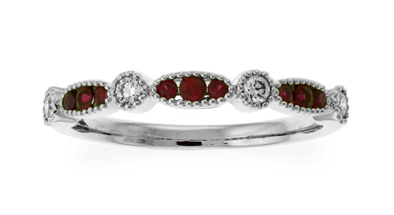 This classical style ring features a single row of alternating round-cut brilliant diamond and three the most radiant purplish red round-cut rubies by accenting alternately. This ring sets a frame of pave-set precious stones going half-way around as a beautiful shaped design. Carnation Designs Signature is on its 18k white gold shank. You will love it your treasure forever!!!
