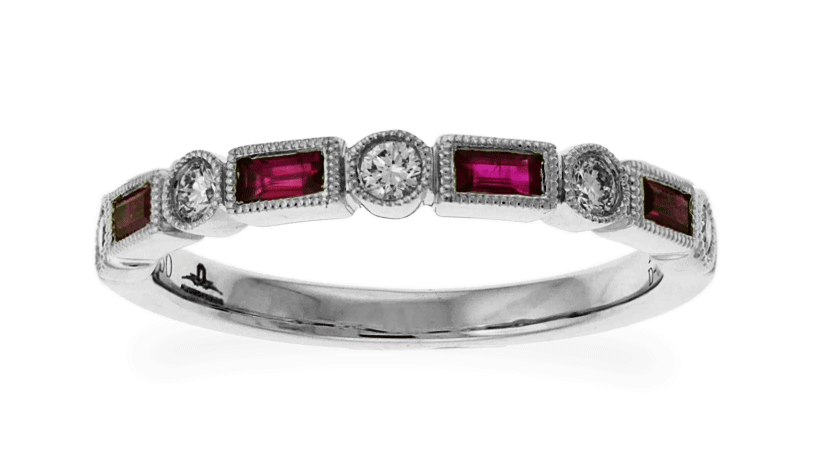 This classical style ring features a single row of one emerald shaped-cut purplish red ruby and one small round cut brilliant diamond by accenting alternately. This ring sets a frame of pave-set precious stones going half-way around in 18k white gold band and Carnation Designs Signature is on its shank. You will love it your treasure forever!!!