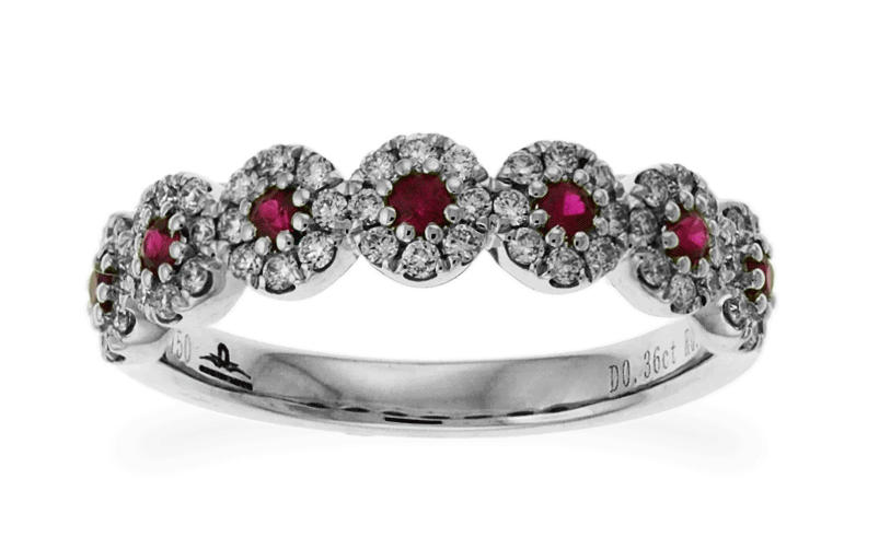 This Carnation Designs Signature ring features the same quality of seven small round shaped cut purplish red rubies accented by small round shaped cut brilliant diamonds as a beautiful design in 18k white gold. You will love to wear it at any time with any wardrobe for your elegant style forever!!!!