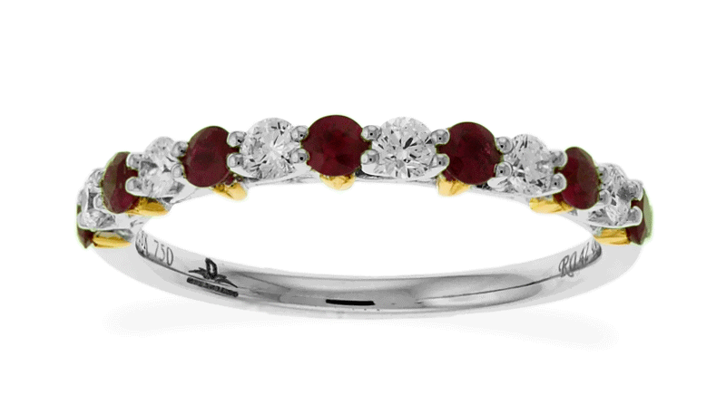 This stunning two-tone ring features a single row of one round-cut brilliant diamond and the deepest purplish red rubies by accenting alternately. This ring sets a frame of pave-set precious stones going half-way around in 18k white gold band. Carnation Designs Signature is burnishing on its shank. It will bring you to wear with any wardrobe at any time.