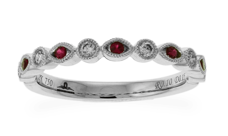 This classical style ring features a single row of one round shaped-cut purplish red ruby and one small round cut brilliant diamond by accenting alternately as a beautiful shaped design. This ring sets a frame of pave-set precious stones going half-way around in 18k white gold band and you can see Carnation Designs Signature on its shank. You will love it your treasure forever!!!