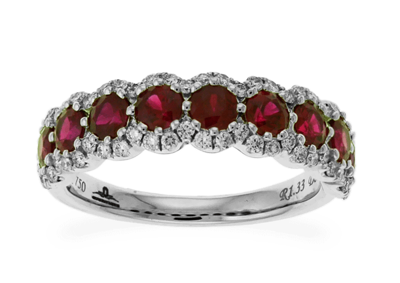 Carnation Designs Signature ring features nine round shaped cut purplish red rubies surrounded by small round cut brilliant diamonds pave-setting. This beautiful 18k white gold ring is perfectly matched to wear at any time with any wardrobe. You will love to wear it for a more glorious style.