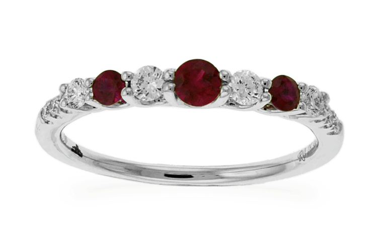 This classical style ring features a single row of one small round shaped cut brilliant diamond and one small round shaped cut the most radiant purplish red ruby by accenting alternately. This ring sets a frame of pave-set precious stones going half-way around in 18k white gold band and Carnation Designs Signature is burnishing on its shank. You will love it your treasure forever!!!