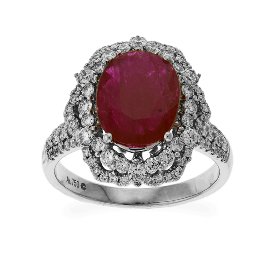 This gorgeous ring is made beautifully from Carnation Designs Signature. It features oval cut purplish red ruby at center and the collection of same quality of small round cut brilliant diamonds pave set. This 18k white gold fashionable ring is for any wardrobe to add your loveliness and you will love to wear it forever!!!