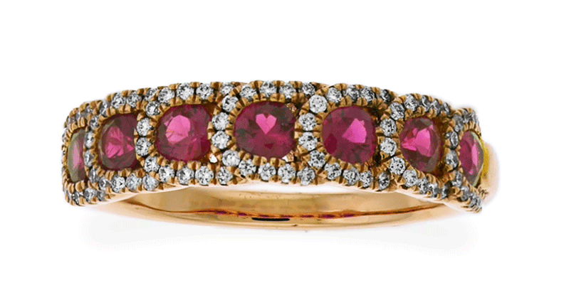 This stunning ring features a collection of same quality of seven round shaped cut purplish red rubies at center and surrounded by same quality of brilliant small round cut diamonds pave set in 18k yellow gold. You can see Carnation-Designs Signature on its shank. It can wear for you perfectly at any time with any wardrobe and will bring your treasure forever!!!