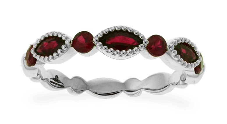 This classical style ring features a single row of alternating marquise shaped-cut purplish red ruby and one small round shaped cut the most radiant purplish red ruby by accenting alternately. This ring sets a frame of pave-set precious stones going half-way around in18k white gold band and you can see Carnation Designs Signature on its shank. You will love it your treasure forever!!!
