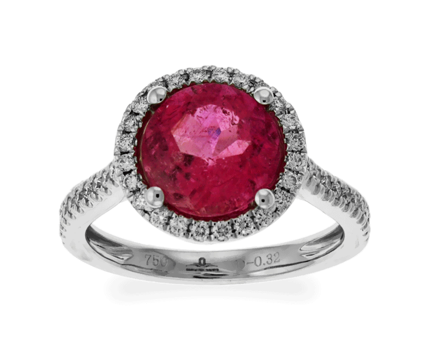 This fabulous solitaire ring features the most radiant purplish red round shaped cut ruby at center enclosed with small round cut sparkling diamonds pave-set in 18k white gold. This ring is proficiently created by Carnation Designs and its Signature is on its shank. It will bring you to wear at any time with any wardrobe for your unique style.