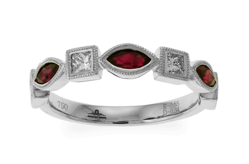 This classical style ring features a single row of alternating marquise shaped-cut purplish red ruby and one small square shaped cut diamond by accenting alternately. This ring sets a frame of pave-set precious stones going half-way around in 18k white gold band and you can see Carnation Designs Signature on its shank. You will love it your treasure forever!!!