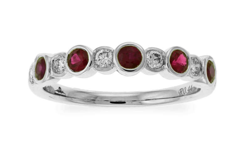 This classical style ring features a single row of alternating round-cut brilliant diamonds and purplish red rubies. This ring sets a frame of pave-set precious stones going half-way around in 18k white gold band. Carnation Designs Signature is stamped on its shank. It will bring you to wear at any time with any wardrobe!!!