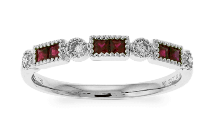 This classical style ring features a single row of alternating square shaped-cut two purplish red rubies and one small round cut brilliant diamond by accenting alternately. This ring sets a frame of pave-set precious stones going half-way around in 18k white gold band and Carnation Designs Signature is on its shank. You will love it your treasure forever!!!