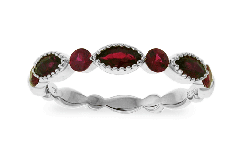 This classical style ring features a single row of alternating marquise shaped-cut purplish red ruby and one small round cut radiant purplish red ruby by accenting alternately. This ring sets a frame of pave-set precious stones going half-way around in 18k white gold band and you can see Carnation Designs Signature on its shank. You will love it your treasure forever!!!