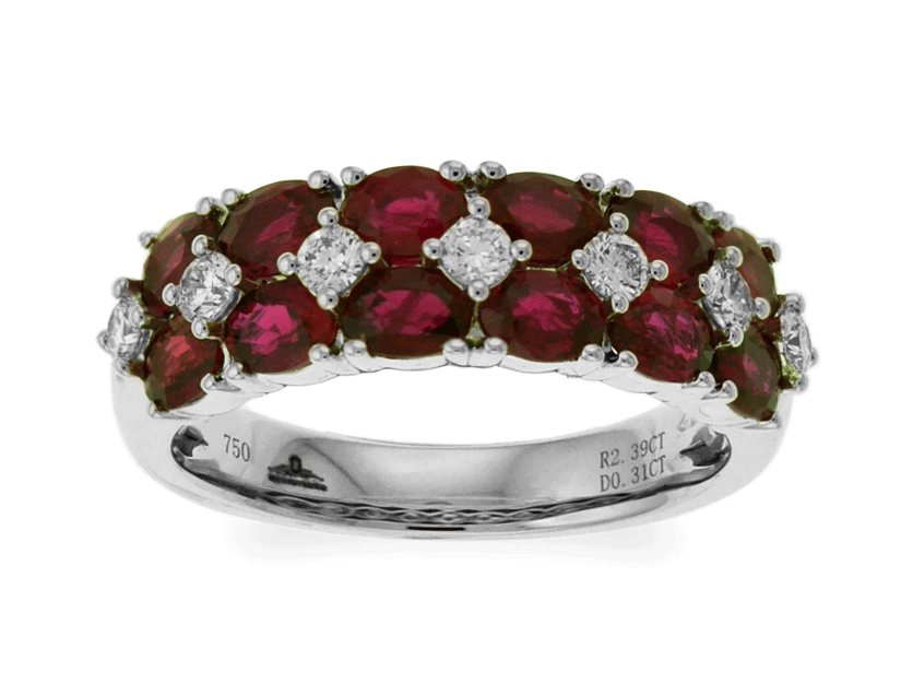 This Carnation Designs Signature ring features oval shaped cut purplish red rubies of simple settings with small round shaped cut brilliant diamonds as a beautiful shaped design. This fantastic 18k white gold band will show your own classical style.