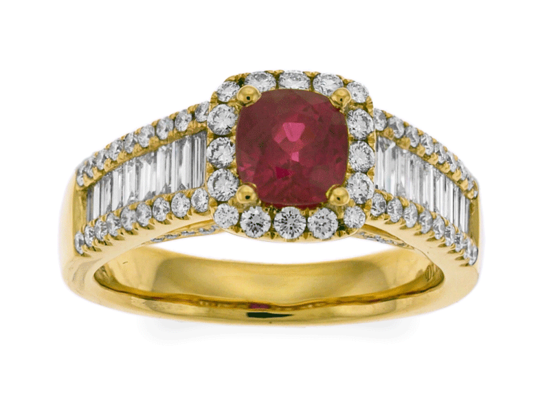This stunning ring features a frame of pave set; one cushion shaped cut the most radiant purplish red ruby surrounded by small round-cut brilliant diamonds. It is accented by small round cut and baguette cut brilliant diamonds in 18k yellow gold. Carnation Designs Signature ring wears with any wardrobe at any time. It will bring you to wear on your finger forever!!!