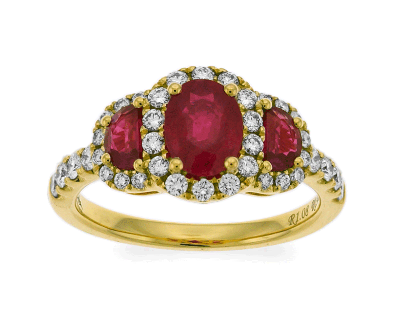 This gorgeous three stones rubies ring features one oval shaped cut purplish red ruby at center with surrounding round-cut brilliant diamonds and one-half moon shaped cut the most radiant red ruby accented on each side in 18k yellow gold band. This ring is beautifully created by Carnation Designs and its Signature is on its shank. It will bring you to wear your treasure forever!!!