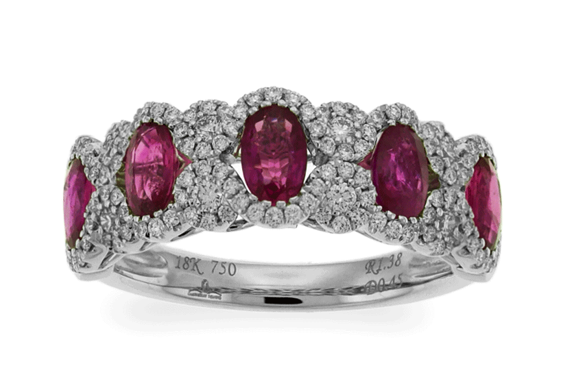 This Carnation Designs Signature ring features a collection of same quality of five oval shaped cut vivid purplish red rubies in center and surrounded by a beautiful design of brilliant small round cut diamonds pave set in 18k white gold. It will bring you to wear perfectly any wardrobe at any time.