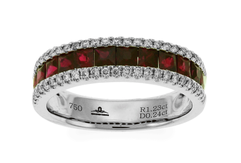 This classical style ring features the center row by spreading a single row of purplish red small square cut rubies attached with two rows of brilliant round cut diamonds pave set in 18k white gold band. Carnation Designs Signature is burnishing on its shank. It will bring you to wear your treasure forever!!!