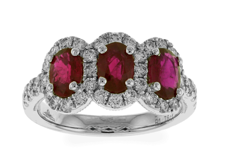 This stunning ring features a collection of same quality of three oval shaped cut purplish red rubies at center and surrounded by same quality of brilliant small round cut diamonds pave set in 18k white gold. Carnation-Designs Signature is burnishing on its shank. It can wear for you perfectly at any time with any wardrobe and bring your treasure forever!!!