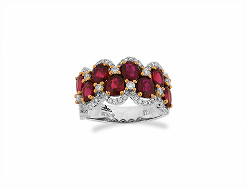 This Carnation Designs Signature two tone ring features a collection of same quality of eight oval shaped cut purplish red rubies at center and surrounded by same quality of brilliant small round cut diamonds pave set in 18k white and yellow gold. It can wear for you perfectly at any time with any wardrobe forever!!!