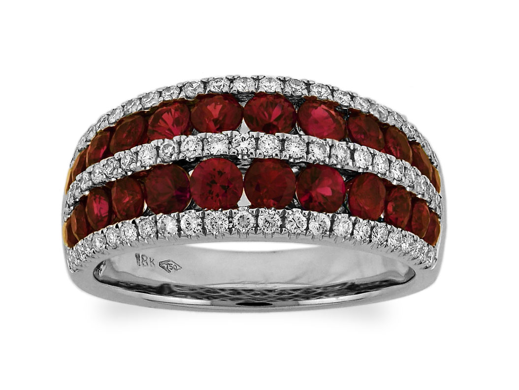 Carnation Designs Signature ring features the two rows of small round shaped cut purplish red rubies by spreading attached with three rows of small brilliant round cut diamonds pave set. This beautiful 18k white gold band will show your own classical style.