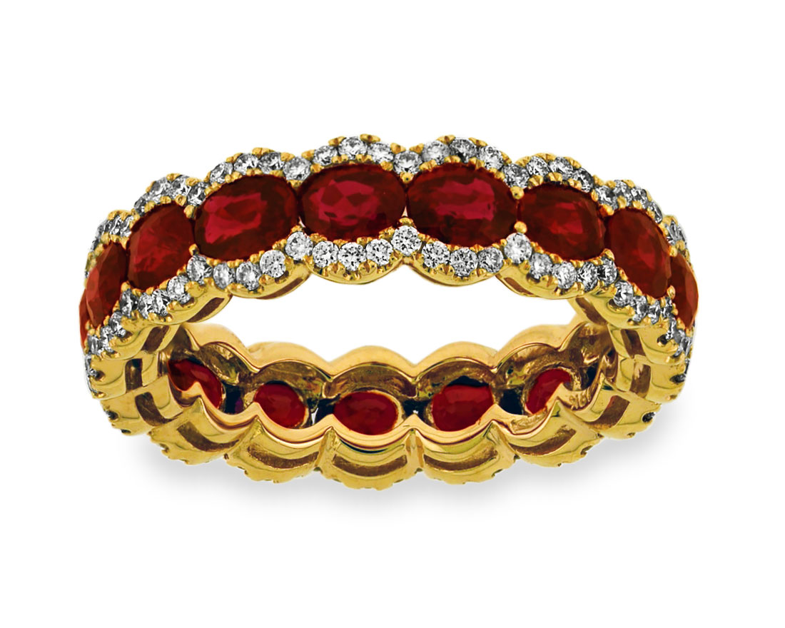 This classical style eternity ring features a single row of oval shaped cut purplish red rubies attached with two rows of small round shaped cut brilliant diamonds. This ring sets a frame of pave-set precious stones in18k yellow gold band and Carnation Designs Signature is burnishing on its shank. It will bring you to wear at any time with any wardrobe for your unique style.