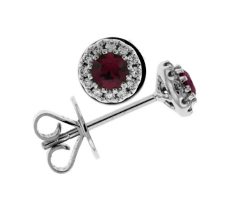 This amazing purplish red ruby earring is made especially from Carnation Designs Signature. It features one small round shaped cut the most radiant deep purplish red ruby that is surrounding by small round cut brilliant diamonds pave set in 18k white gold. It can be worn at any time with perfect match for any wardrobe.
