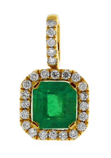 This Carnation Designs Signature pendant features lush green emerald shaped cut emerald. You will see the quality of its rich green color and high brilliance. It is surrounded by small brilliant round cut diamonds in 18k yellow gold. It will bring you to wear at any time with any wardrobe for your unique style.