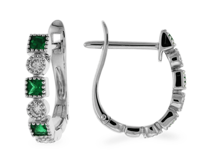This classical style earring features one vivid green square-cut emerald and one small round cut brilliant diamond by accenting alternately. This hoop earring sets a frame of pave-set in18k white gold. Carnation Designs Signature earring makes her beautiful smile to wear it lovingly!!!