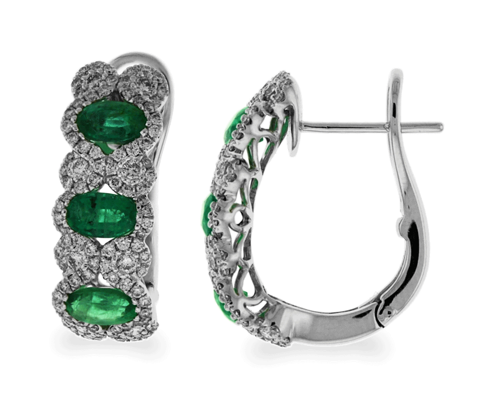 This Carnation Designs Signature earring features a collection of same quality of three oval shaped cut vivid green emeralds in center and surrounded by a beautiful design of brilliant small round cut diamonds pave set in 18k white gold. It makes her beautiful smile to wear it lovingly!!!