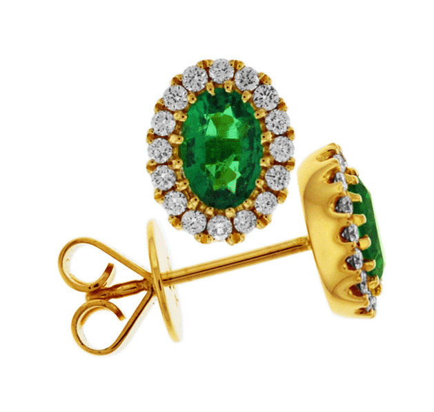 This stunning lush green emerald earring is made especially from Carnation Designs Signature. It features one oval cut the most radiant green emerald in center that is surrounding by small round cut brilliant diamonds pave set in 18k yellow gold. It can be worn at any time with perfect match for any wardrobe.