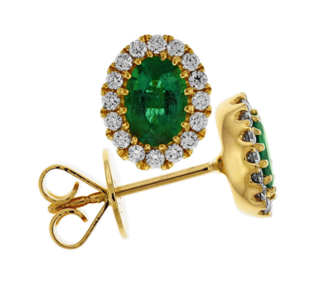 This stunning lush green emerald earring is made especially from Carnation Designs Signature. It features one oval cut the most radiant green emerald in center that is surrounding by small round cut brilliant diamonds pave set in 18k yellow gold. It can be worn at any time with perfect match for any wardrobe.