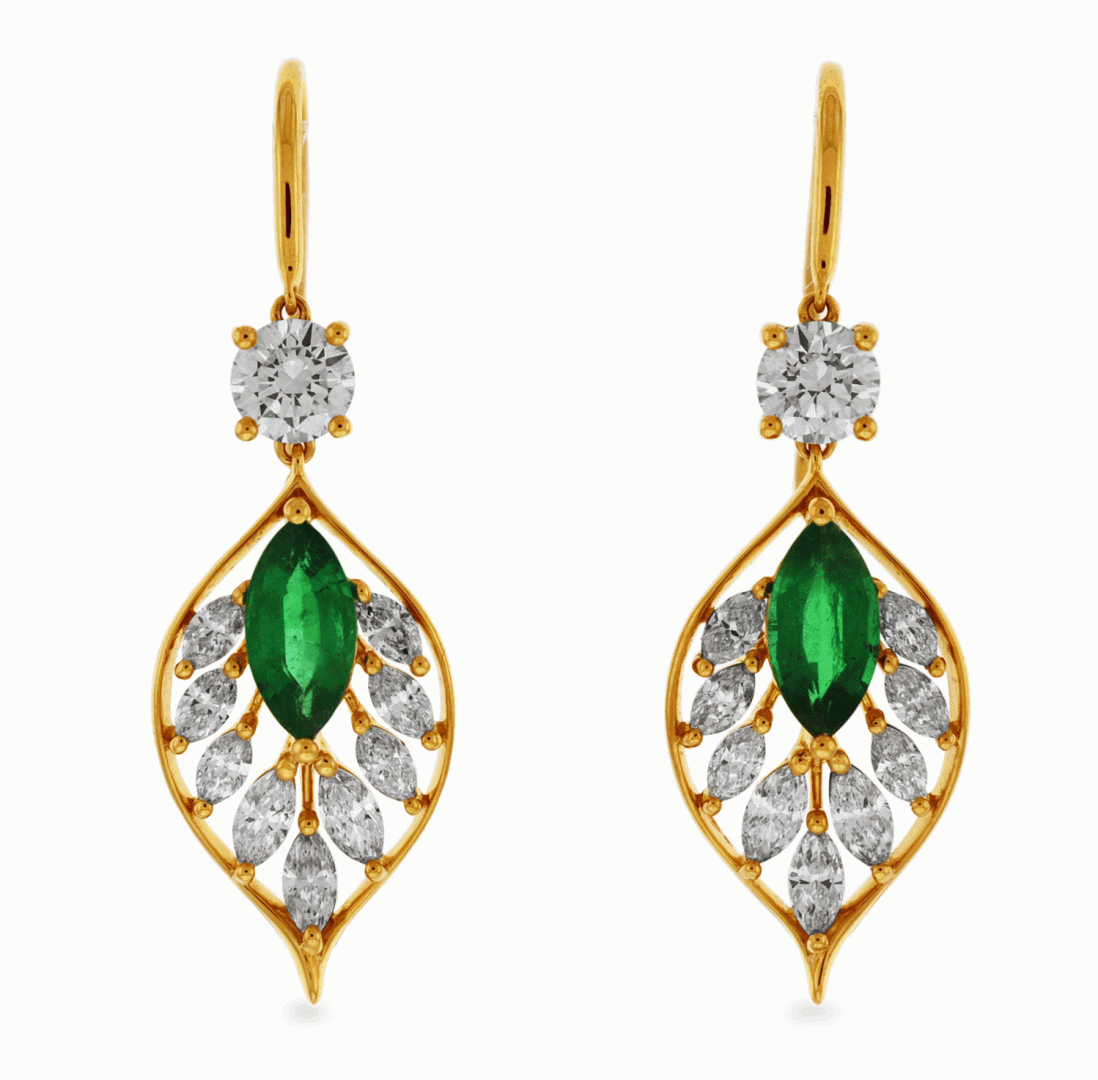 This gorgeous earring is made beautifully from Carnation Designs Signature. It features mixing numerous marquise and small round-cut brilliant diamonds and lush green marquise shaped cut emeralds accented in 18k yellow gold. It makes her beautiful smile to wear it lovingly!!!
