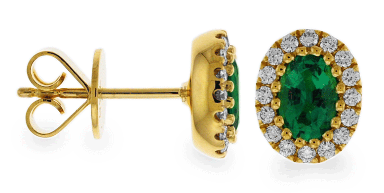 This stunning lush green emerald earring is made especially from Carnation Designs Signature. It features one oval cut the most radiant green emerald in center that is surrounding by small round cut brilliant diamonds pave set in 18k yellow gold. It can be worn at any time with perfect match for any wardrobe.