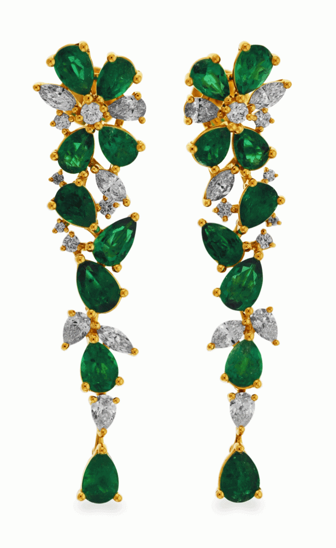 This amazing earring features a collection of same quality of pear shaped cuts of vivid green emeralds, design- set to wear nicely on your ears with intense color and mix shaped cut brilliant diamond-accents. This fantastic style earring is created from Carnation Designs and you can see its Signature on its 18k yellow gold. It will bring your treasure forever!!!