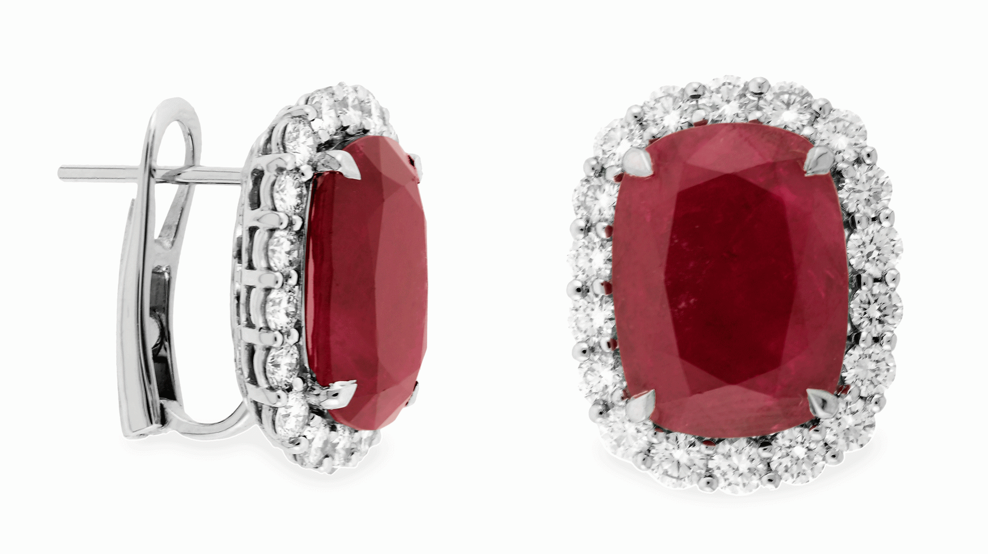 This gorgeous earring is made beautifully from Carnation Designs Signature. It features an oval shaped cut the most radiant red ruby in center that is surrounding with the collection of same quality of small round-cut brilliant diamonds pave set. This 18k white gold classy earring is for any wardrobe to add your loveliness.